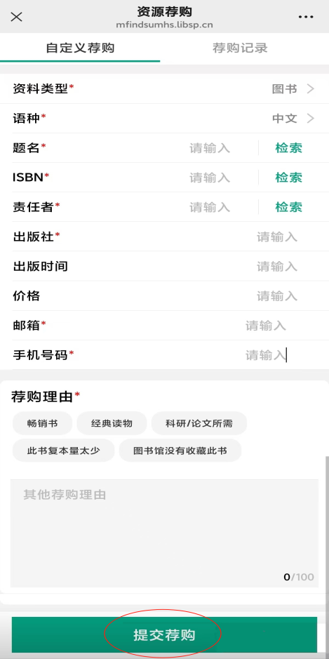 提交推荐: 确认信息无误后,点击“提交荐购”按钮。