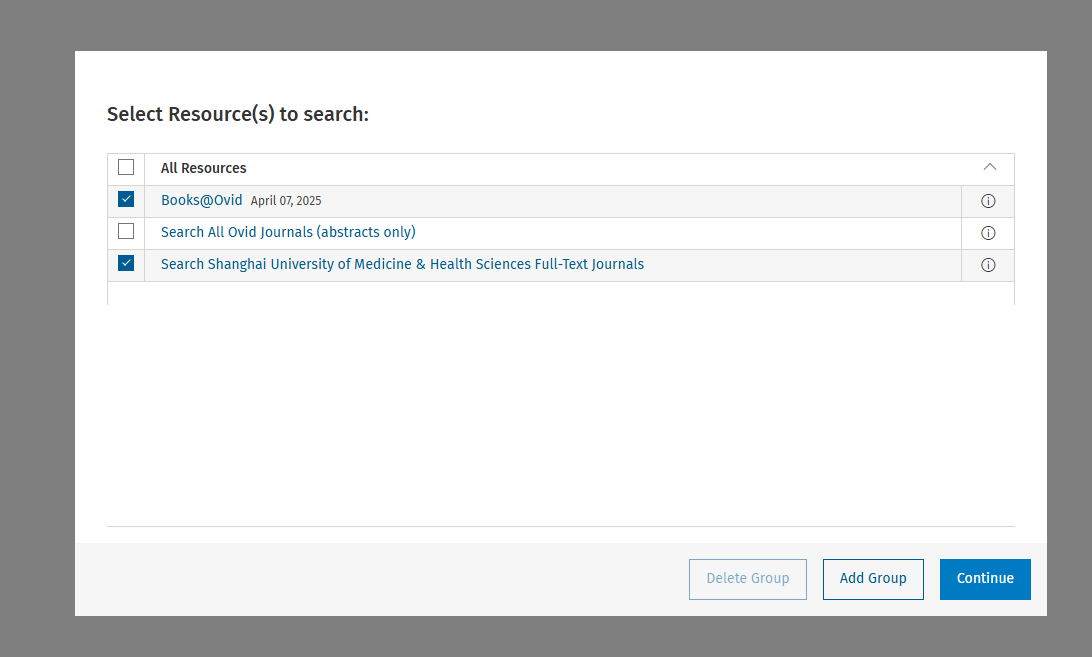 登录OVID平台,勾选Books@Ovid和Search Shanghai University of Mdeicine&Health Sciences Full-Text Journals,点击上方Journals或Books标签,即可打开所有期刊列表和电子书目列表。