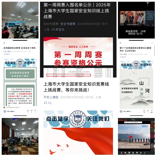 在上海市大学生国家安全知识线上挑战赛中,我校学生展现出扎实的知识功底与昂扬的青春风貌!24级医学影像技术(本科)2班学生金子涵凭借稳定的发挥,在周赛总积分排名中脱颖而出,勇夺全市高校第七名。24级食品卫生与营养学本科班陈昊阳、24级药学本科3班孙敏津以优异的成绩,亦成功斩获周赛参赛资格。征文比赛中,学生们参与热情高涨,以“时光卷轴里的安全必修课”为主题,用文字记录对国家安全的理解。此次征文共收到作品97篇,评选出一等奖5名、二等奖10名、三等奖15名。97篇征文如星火汇聚,折射出我校学生对总体国家安全观的深刻理解。24级临床医学本科6班学生治保委员麦麦提玉素甫·达吾提在《时光卷轴中的国安印记:从懵懂到担当》中写到“每一寸国土都不容侵犯,每一位戍边战士都是我们的英雄,他们的奉献和牺牲,换来了我们后方的和平与安宁。也让我明白,国家安全并非遥不可及,它就在我们身边,需要我们时刻保持警惕。”优秀征文通过国家安全宣传活动现场、公众号平台等进行展示,形成“以文促学、以学促行”的浓厚氛围。