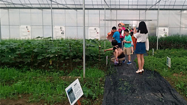 炎炎夏日,35℃的高温也未能阻止大家前行的脚步。到达目的地之后,放眼望去,大片的绿色植物吸引了孩子们的眼球,他们欢呼着奔向前方。坐上想象的秋千,迈向“勇敢者之路”,看着路边那些平日在菜场上、超市里才能看到的植物,小朋友们雀跃不已:原来火龙果的叶子有这么长!豇豆也像葡萄一样挂着长的!走过园林长长的小道,大家终于来到中草药的世界,园区工作人员详细讲解了枸杞、金钱草、养心菜、薄荷、紫背天葵、马兰头、艾草等中药的神奇功效,让孩子们惊叹不止,不少小朋友跃跃欲试:回家我自己也要种!