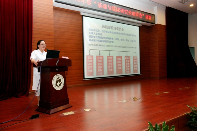 本次培训的主讲人为伦理委员会副主任委员、老年科主任侯月梅教授。她首先详细介绍了伦理委员会的职能、审查程序、以及伦理最关注的知情同意书填写的相关知识,之后以典型的案例深入浅出的讲授了器官移植、生殖助孕、克隆、干细胞治疗、紧急救援、HIV患者治疗等伦理学热点和前沿问题,又通过一些生动的事例让现场听众了解患者和医生拥有的权利和应尽的义务。最后,侯教授介绍了多年来在动物伦理学方面的丰富经验和突出的工作业绩,也开阔了大家对伦理学的眼界。