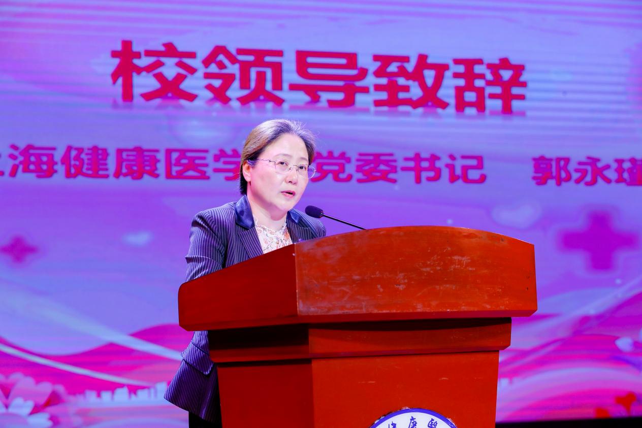 授帽仪式是一堂生动的思政大课。本次主题活动分为两大篇章,第一篇章是“凝聚仁心之力,护理薪火永传承”。郭永瑾致开幕词,今年恰逢学校建校10周年,十年来,学校精准对接卫生健康事业和生物医药产业发展对高水平应用型人才的需求,践行培养高质量基层健康“守门人”、兜牢基层健康服务体系“网底”的初心使命,助力上海建设结构优化的多层次医疗卫生人才队伍,使学校成为上海医学教育布局中特色鲜明、不可或缺的重要组成部分。我校坚持“健康促进的使者,白衣天使的摇篮”的历史传承,将价值塑造、知识传授和能力培养三者融为一体,积极构建“产学研赛扶创”六位一体的护理人才培养模式,培养具备“会沟通、会评估、会计划、会实施、会宣教、会改进(反思)”的高素质应用型护理人才。十年来,学校已培养护理相关专业毕业生1.2万人(占学校人才培养总数的1/3),90%以上的毕业生进入各级各类医疗卫生机构,70%毕业生进入上海三级医院,服务生命全周期、健康全过程。学校也是世界技能大赛“健康和社会照护项目”国家主训练基地,我校培养的选手吴怡欣和曾小桉代表中国分别获得第46、47届世界技能大赛健康和社会照护项目铜牌,实现我国在该项目上的历史性突破,为推进特色鲜明的高水平应用型医学院校建设实践、筑牢中国式现代化健康之基贡献力量。当前,护理事业发展迎来新机遇,我们要更加紧密地团结在以习近平同志为核心的党中央周围,凝心聚力,勇毅前行,秉承校训院训精神,为早日实现健康中国宏伟蓝图建立护理的时代新功。