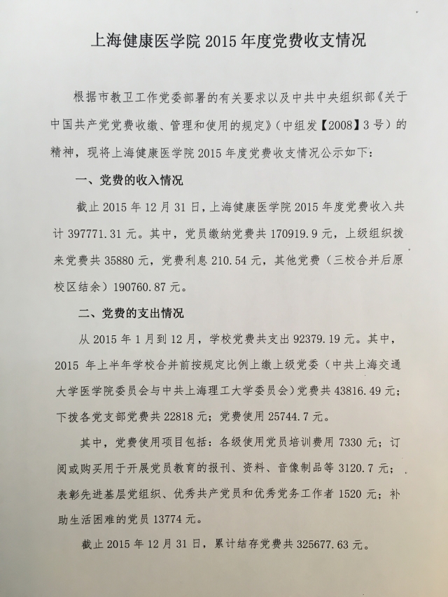 根据上级部门的有关要求,现将2015年度中管党费收支情况、上海市2015年度市管党费收支情况和上海市教卫工作党委2015年度党费收支情况以及上海健康医学院2015年度党费收支情况进行公示。