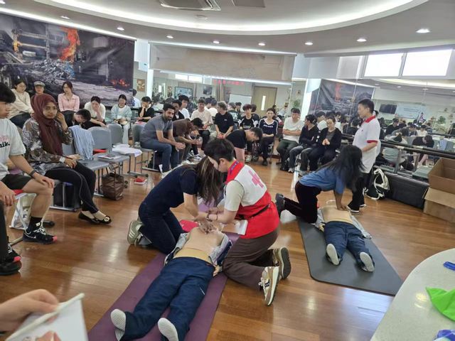 留学生们与本土师生并肩而坐,共同在急救培训课堂上展开了一场关于生命守护的深度对话。从心肺复苏的精准操作到创伤包扎的默契配合,急救知识的种子播撒在多元文化的土壤里。一位来自非洲的留学生在培训后感慨:“我第一次系统学习急救技能,觉得非常有意义,以后无论在校园内还是日常生活中,遇到突发情况我都更有信心了。”这场无国界的技能共享架起了跨文化交流的桥梁。