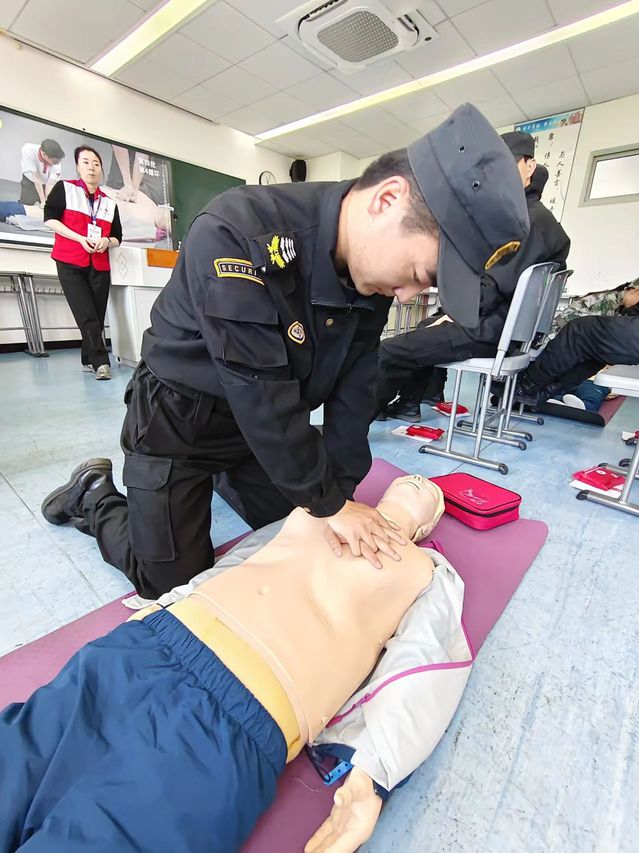 校内保卫、物业等“隐形守护者”首次全员参加应急救护培训。通过专业培训与实战演练,这些一线工作者化身“应急先锋”,不仅练就“黄金四分钟”救护硬功夫,更织密校园安全防护网。从保安到保洁,从门卫到维修工,全员持证上岗,让生命守护力渗透校园每个角落。