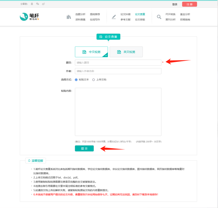 论文检测分为中文检测及英文检测,选择对应的语言,输入标题后,可将论文内容粘贴至对应对话框内,点击“提交”即可。