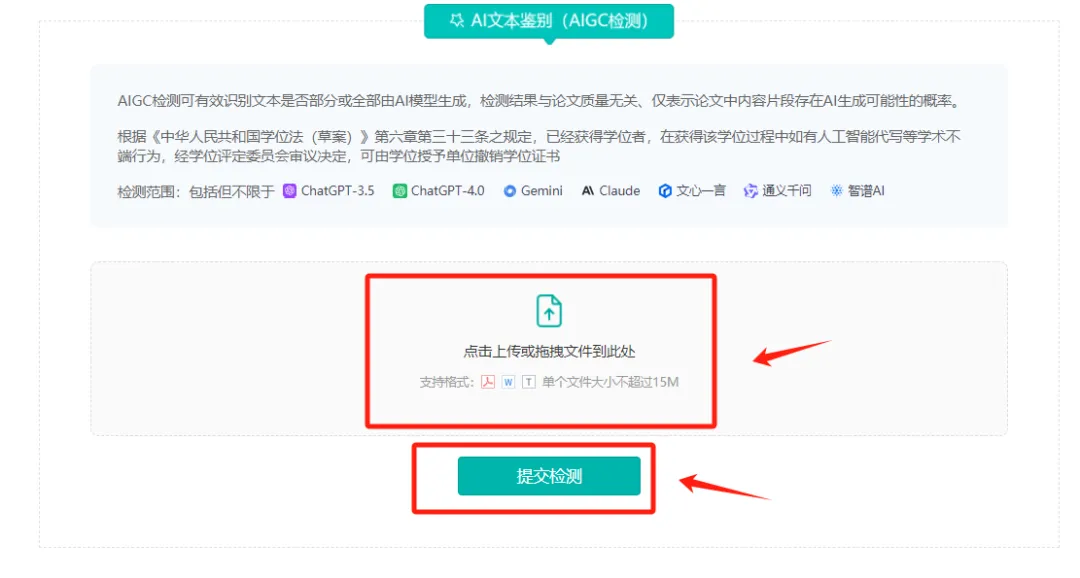 检测文档支持PDF、WORD、TXT等格式。