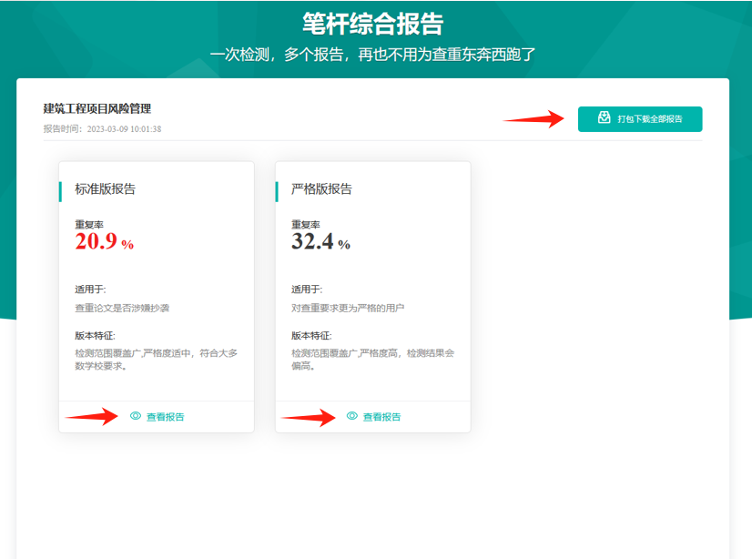 检测报告分为标准版和严格版,可单独查看,也可以点击“打包下载全部报告”,将报告全部下载到本地查看。