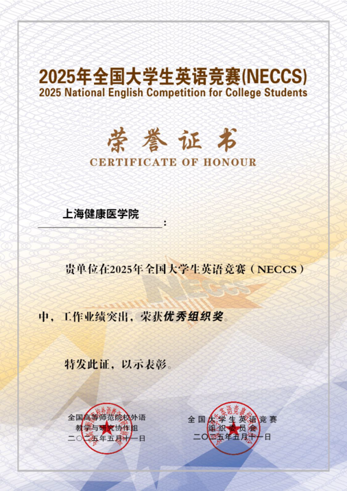 近日,我校临床医学院2024级学生蔡宇旸在教育部高教司批准举办规模最大、影响力最广的大学生英语赛事中,凭借扎实的语言功底和出色的临场发挥,从上海赛区41所参赛高校的选手中脱颖而出,在笔试和口试环节均表现优异,获得国家级特等奖。这是我校学生连续两年蝉联该项赛事的最高奖项。另有6名同学荣获国家级一等奖,他们分别是:临床医学院江咏轩、张佳怡,护理与健康管理学院方一欣,医学技术学院吴冯怡、仇天怡,以及健康与公共卫生学院张钰劼。