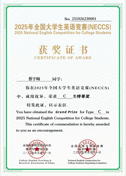 我校学生蝉联全国大学生英语竞赛决赛特等奖