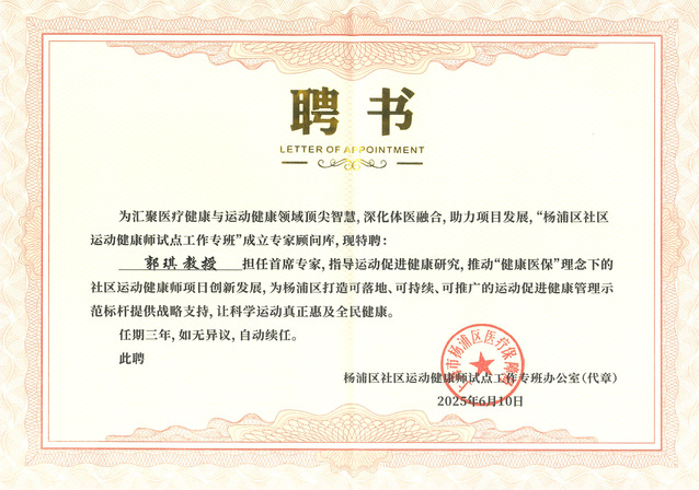 为汇聚医疗健康与运动健康领域顶尖智慧,深化体医融合,助力项目发展,杨浦区医保局聘请郭琪教授担任首席专家,推动“健康医保”理念下的社区运动健康师项目创新发展,让科学运动真正惠及全民健康。