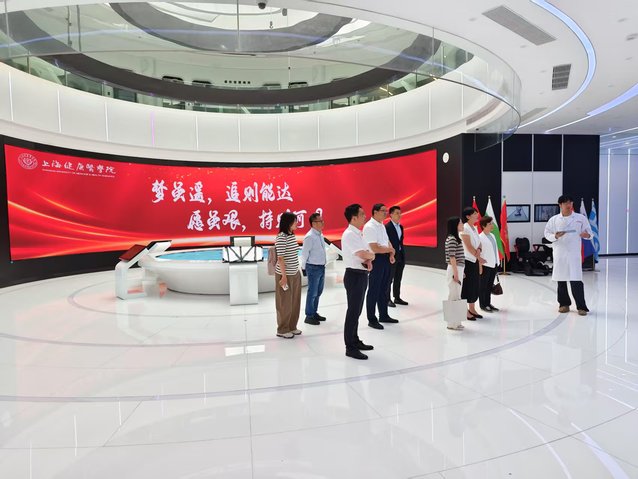 娄小娥校长一行还在教务处处长王莉和医学影像学院院长、校教学督导组组长徐小萍的陪同下参观了上海市智能医疗器械与主动健康协同创新中心。来宾深入了解了中心在智能穿戴设备、远程健康监测等领域的产学研成果,对我校推动医疗器械与主动健康技术融合的创新模式表示高度赞赏。接下来参观了康复学院,包括康复机器人训练室、虚拟情景康复实验室等特色场景,展现了学校特色的康复人才培养体系,凸显了医学教育的实践导向。最后来宾一行还考察了护理与健康管理学院(上海现代护理开放实训中心)的智慧病房、急危重症模拟救治单元等设施,了解了护理教育数字化转型成果等情况。