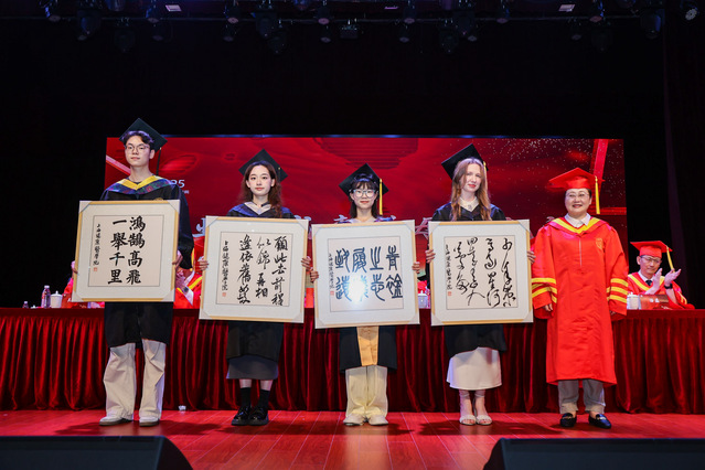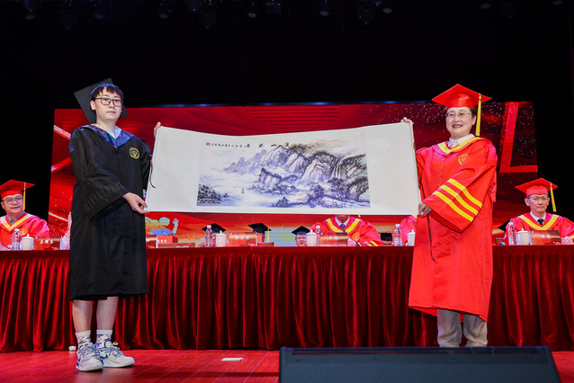 礼赠传情,情深意暖。校党委书记郭永瑾代表学校对毕业生送上毕业祝福。“鸿鹄高飞,一举千里”、“青衿之志,履践致远”、“愿此去前程似锦,再相逢依旧入故”、“少年策马过星河、回首青山入梦多”,这既是母校对即将步入新阶段的学子的殷切嘱托,同时也承载着母校对毕业生的惦念与祝福。毕业生代表则献上他们亲手创作的水彩山水画《青山入梦》,画卷层峦叠翠,烟云浩渺,既是对母校谆谆教诲的深情回响,亦将恩师临别赠言中的壮阔意象定格为永恒。一赠一答之间,满载期许的箴言与凝聚感恩的丹青交相辉映,生动诠释了上健医学子与母校间那份铭刻于心的血脉深情。