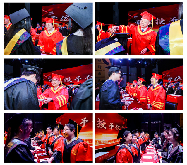 奋辑笃行,载誉而归。毕业典礼上,唐红梅宣读2025年度上海市优秀毕业生、校级优秀毕业生以及校长荣誉学位获得者名单,由台上领导为获得者颁奖,所有努力与收获在此刻被铭记。