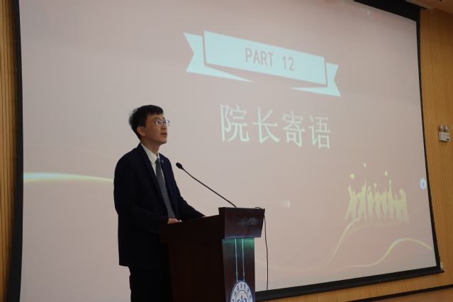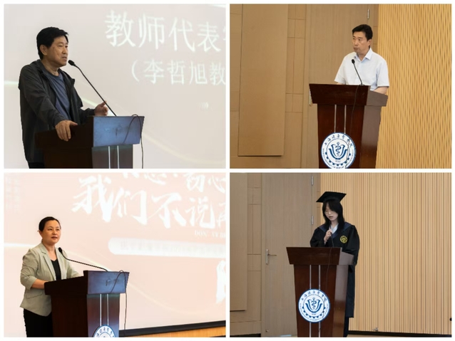 教师代表李哲旭和校友代表——上海市第六人民医院放射科技师长胡顺东先后发言。李哲旭回顾了与同学们相处的点滴时光,鼓励大家在未来的工作与学习中,保持对专业的热爱与执着、不断探索创新,为医学影像事业的发展贡献自己的力量。胡顺东分享了自己的职场经验,饱含深情为毕业生送上寄语,叮嘱大家要保持一颗工匠之心、仁爱之心和科研之心,在工作中有所作为。恩师的叮咛、校友的寄语化作无限前行的力量,激励着在场每一位同学。