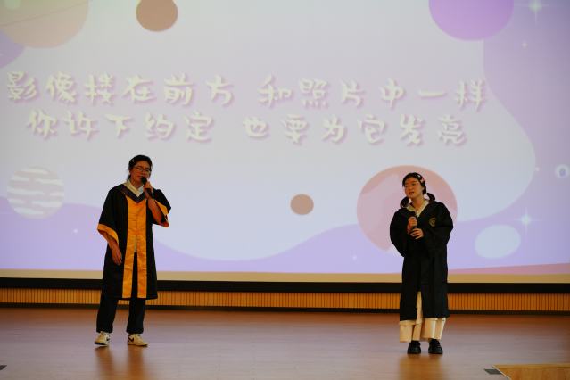 欢送仪式在一首欢快的歌曲中拉开帷幕。由21级医学影像技术1班王佳玲与24级医学影像技术专升本班卫紫琳同学共同改编和演唱的歌曲《有光》将现场气氛点燃。随后,毕业纪念视频中的一帧帧画面将大家带回过往的大学时光——熟悉的教学楼、实验室、操场,那些难忘的回忆让很多同学湿了眼眶。青春序曲奏响回忆与祝福交织,说再见是多么不舍。