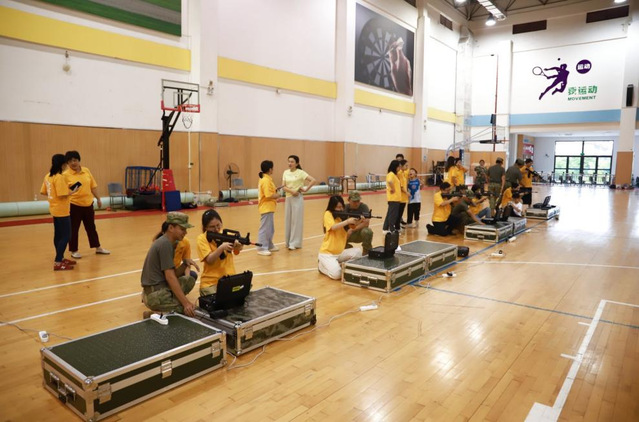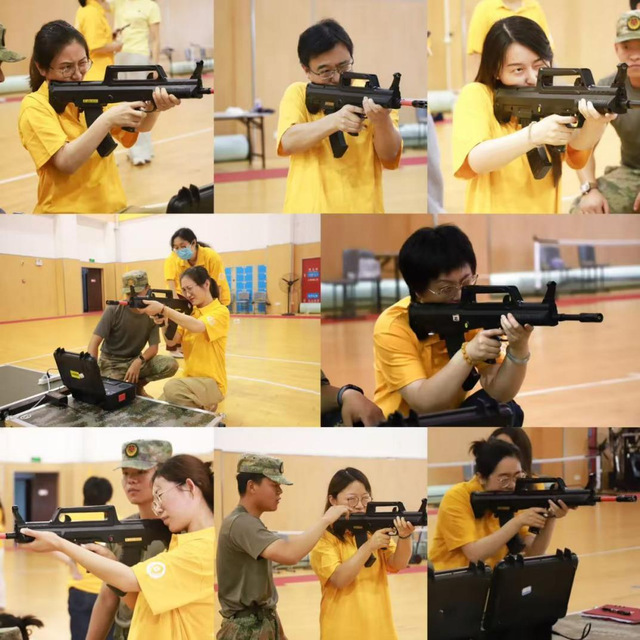 最后,开展了伟大建党精神与国防教育实践活动。由教官现场讲解了军事理论,射击学理与安全规范培训,为教职工普及军事基础知识。射击体验环节采用分组操作模式,由教官进行一对一指导,让大家在实践中感受国防教育的重要性。