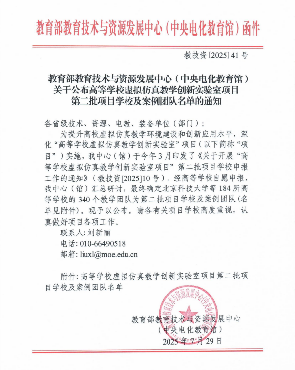 近日,教育部教育技术与资源发展中心公布高等学校虚拟仿真教学创新实验室项目第二批项目学校及案例团队名单(教技资〔2025〕41号),我校2个案例成功入选。