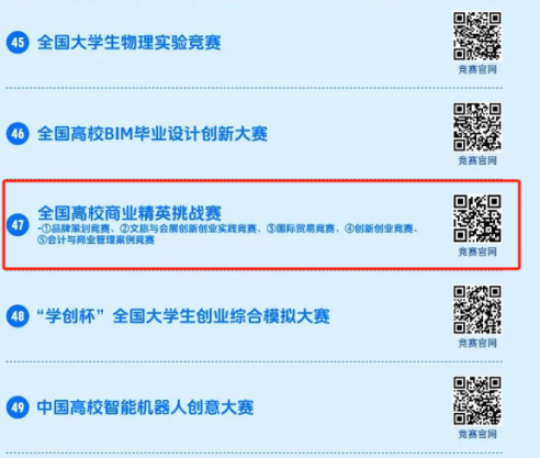 全国高校商业精英挑战赛由中国国际贸易促进委员会商业行业委员会、中国国际商会商业行业商会、中国商业文化研究会与中国商业经济学会联合主办,被纳入中国高等教育学会高校竞赛评估与管理体系研究工作组发布的《全国普通高校大学生竞赛排行榜》。