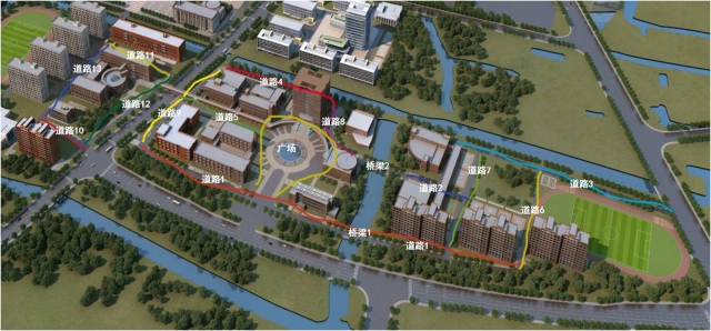 道路1、道路2、道路3、道路4、道路5、道路6、道路7、道路8、道路9、道路10、道路11、道路12、道路13;桥梁1、桥梁2;广场。详见示意图。