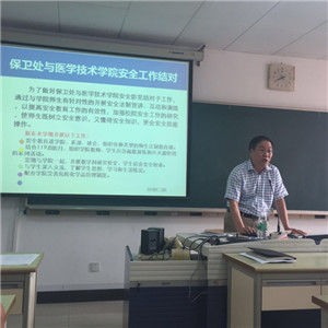保卫处处长施晓谋首先从消防安全、治安防范、实验室安全、交通安全和反恐维稳等方面对学院的安全工作给予了指导,并介绍了保卫处与学院安全防范结对工作的具体措施,帮助师生树立安全意识,掌握安全知识,学会安全操作技能,保障校院安全教育工作的有效推进。医学技术学院副院长陈凤贞传达了新学期干部会议精神,并从行政管理、教育教学、校企合作、实验室建设、国际交流、师资培训等方面对新学期工作重点进行了部署,重点就教师办公室调整、教师考核量化实施细则等事宜做了详细介绍。学院党总支副书记陆辉通报了新生上课出席情况,并就新学期学生纪律、管理、安全事宜等方面提出了具体的要求。