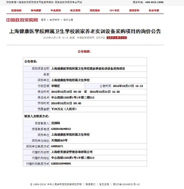 上海健康医学院附属卫生学校居家养老实训设备采购项目的询价公告