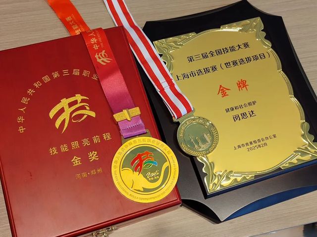 在成功考取上健医护理学专业后,闵思达又锚定了一个新目标:参加职业技能大赛。这源于两位学姐树立的榜样——学校前两位国赛冠军选手吴怡欣和曾小桉,都曾代表中国参加世界技能大赛并拿下铜牌。