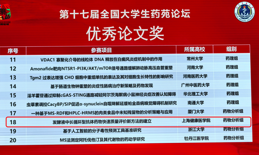经教务处(创新学院)、药学院精心组织,2025年6月11日第十七届全国大学生药苑论坛上海健康医学院校内赛顺利举行。经校内赛遴选,我校选送至国家级比赛的项目“发酵液中长循环型抗体药物快速质量评价新方法的建立”经初赛函评与来自复旦大学、浙江大学、中国药科大学等校的22个项目成功晋级全国排位赛。该项目由药学专业本科生吴佳妮主持,团队成员为同样来自药学专业的翟嘉嘉、龚晨蕾、谢祖莹、顾燕楠,指导教师为药学院药物分析教研室青年教师冯嘉楠。经决赛比拼,该项目荣获“创新成果一等奖”,同时斩获“优秀论文奖”。