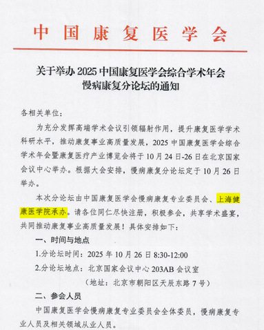 20251024日-26日,以“生态聚合,智慧驱动,引领全生命周期康复新范式”为主题的2025中国康复医学会综合学术年会在北京国家会议中心举行。本次盛会汇聚了全国康复医学领域的顶尖专家、学者、从业者及产业代表,共襄学术盛宴,共绘康复蓝图。在这场高规格的学术盛会中,由上海健康医学院成功承办的“慢病康复分论坛”备受瞩目,充分展现了我校在慢病康复领域的学术影响力与积极贡献。