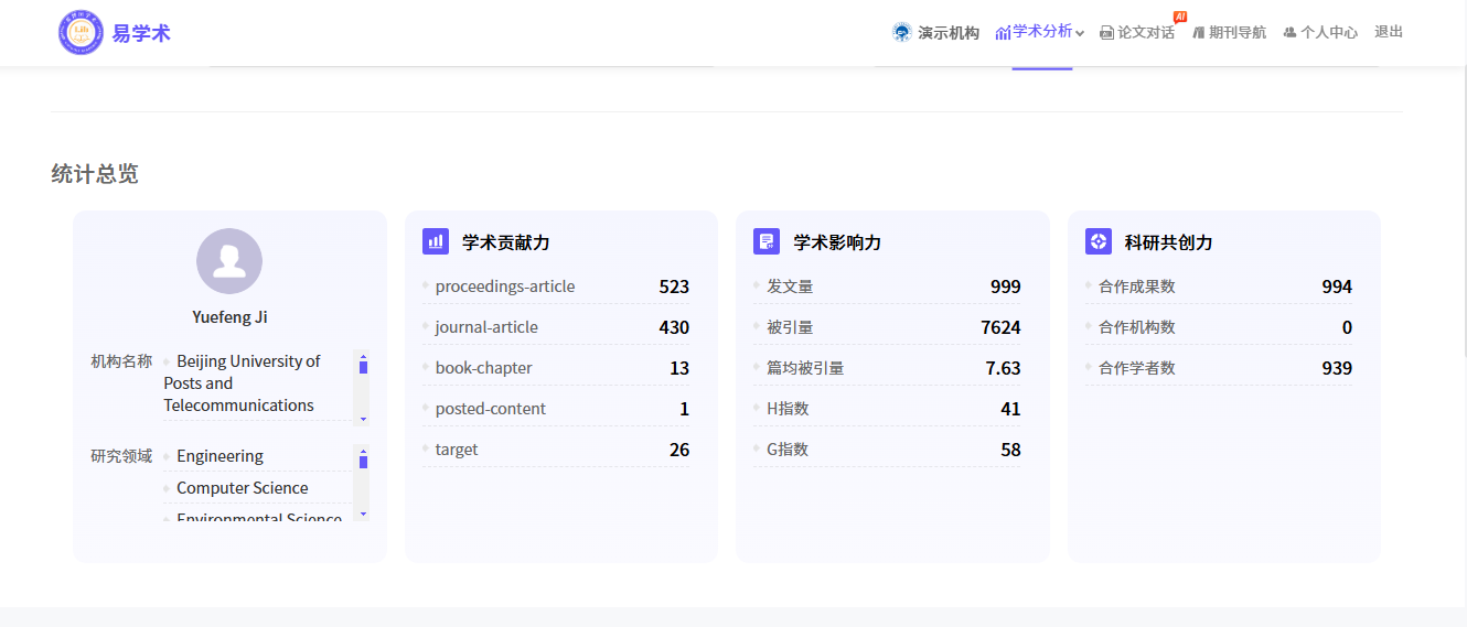 本平台由学术榜单、学者分析、机构分析、学科分析、期刊分析5个功能模块组成