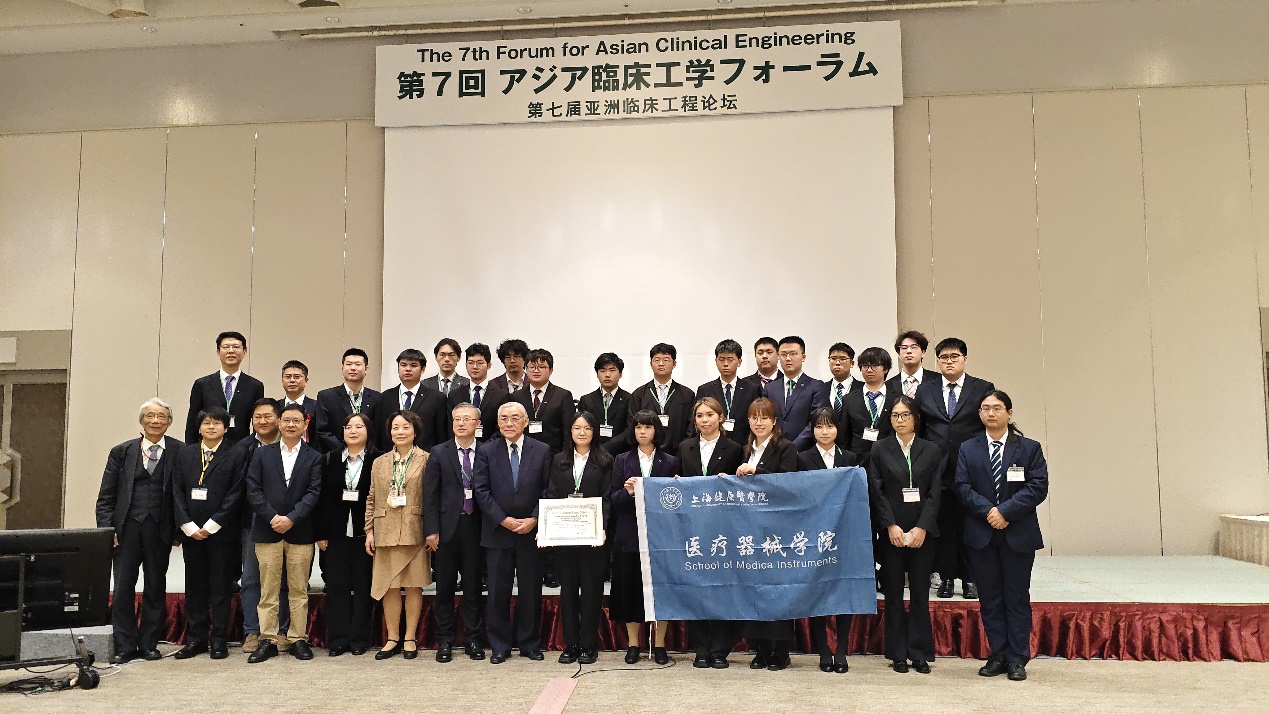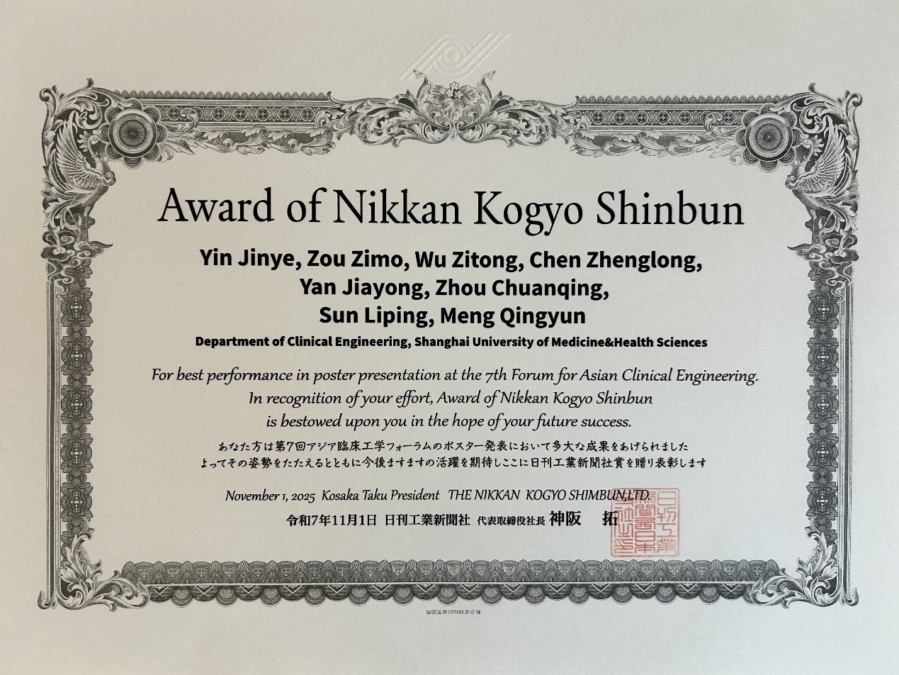 医疗器械学院派出两支代表队参加本次论坛壁报交流,经专家评议,壁报“基于手势识别的手部外骨骼康复系统设计与研究”(学生:印金烨、邹子默、吴子彤)在亚洲各国20支参赛队伍中脱颖而出,荣获日刊工业新闻(Nikkan Kogyo Shinbun)社颁发的最佳壁报奖,在国际舞台上再一次展示了我校临床工程技术专业学生的专业素养。