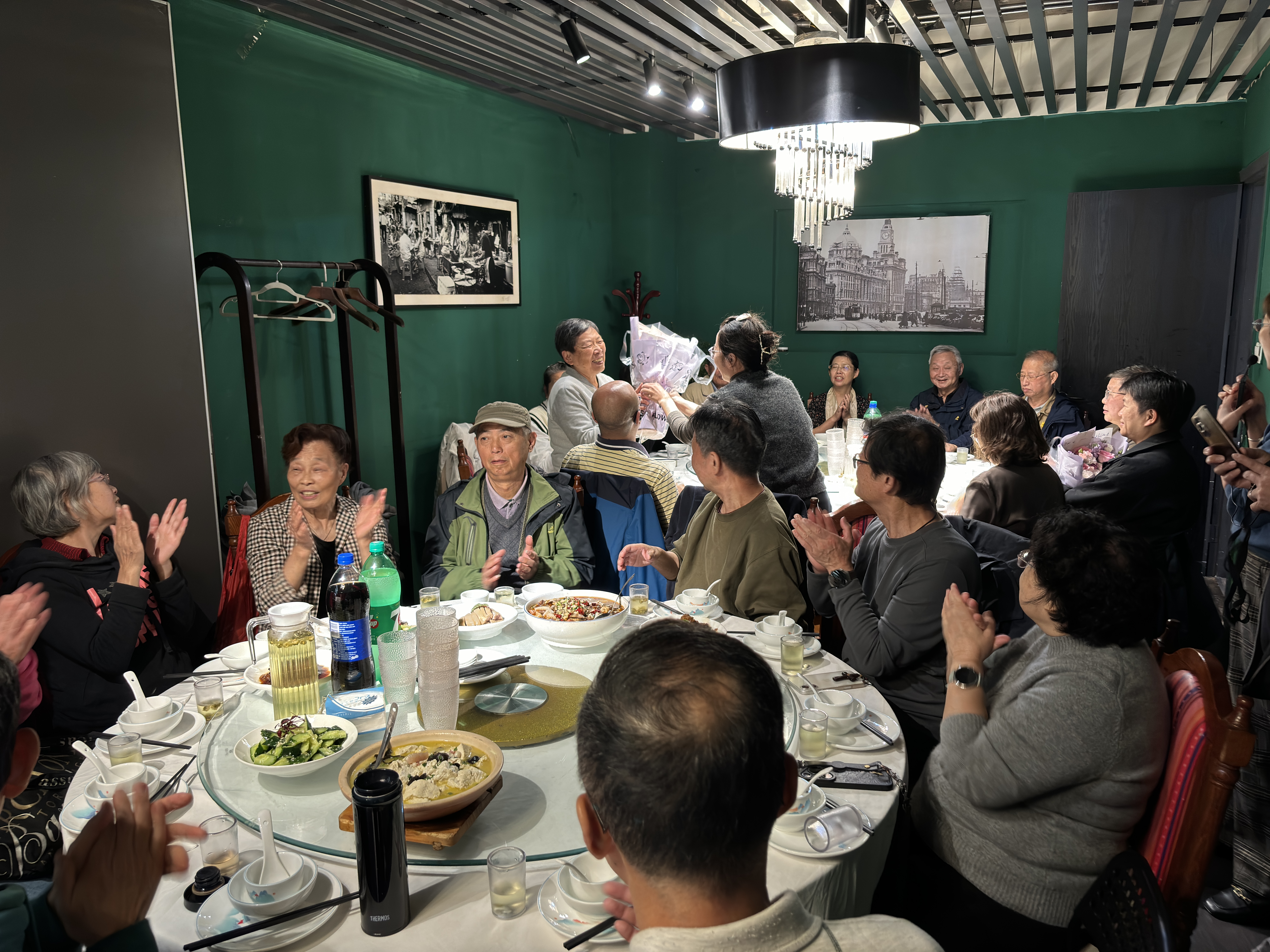 退休老师们齐聚南京路一家中餐厅,他们欢声笑语,开心无比。当天有三位70岁以上“逢十”退休老师参加。当青年教师将饱含敬意的鲜花送到寿星手中时,全场响起了热烈的掌声。老教师们吃长寿面、唱生日歌,大家畅谈往昔峥嵘岁月,共话今朝幸福生活,脸上绽放着灿烂的笑容,现场气氛温馨而欢乐。