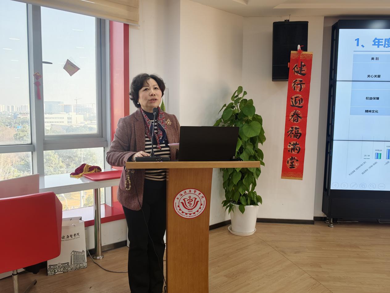 随后,凌文惠代表校工会(妇工委)对2025年度工会(妇工委)工作总结及2026年度工作计划作简要介绍,并提请全体工会委员进行审议。她表示,2025年校工会(妇工委)以“三性促三力”为主线,从“关心关爱、权益保障、精神文化”三个方面进行了量化指标的汇总;全年突出抓政治引领、改革赋能、服务解难、数字创新、巾帼成才五大重点,承办建校10周年汇演、中国人民抗日战争暨世界反法西斯战争胜利80周年邮展等大型活动,建好“教工e家”智慧平台,举办青教赛、劳模宣讲等品牌项目。2026年将持续强化政治性、先进性、群众性,在凝聚奋进力量中充分发挥工会积极作用,不断提高引领力、组织力、服务力,为深化“三医结合”人才培养体系汇聚向上动能。