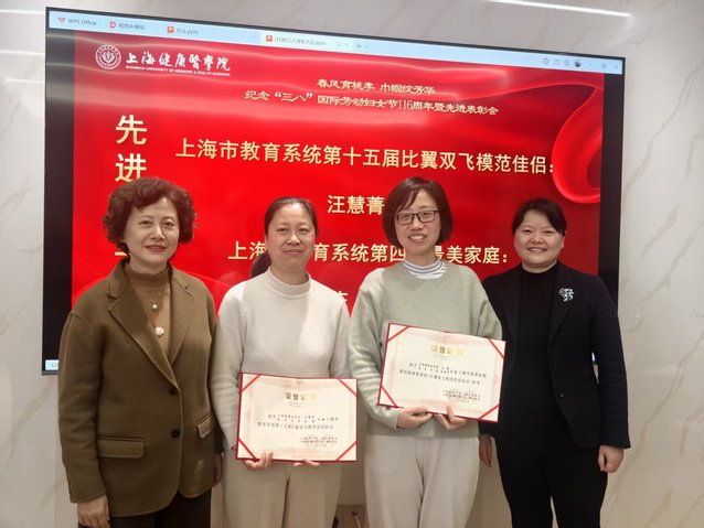 表彰会上,周宁慧宣读表彰名单,唐红梅与周宁慧共同为获奖代表颁奖。基础医学院汪慧菁夫妇荣获“上海市教育系统第十五届比翼双飞模范佳侣”称号,药学院庄婕家庭获评“上海市教育系统第四届最美家庭”。