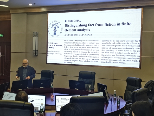 讲座中,Pankaj教授结合全球人口老龄化背景下骨脆性病变、骨植入体存活率偏低的临床痛点,围绕骨骼力学行为的计算机模拟模型开发展开分享。他指出计算生物力学模型是评估生理及意外载荷下骨骼、骨-植入体系统力学行为的核心工具,而构建精准稳健的本构模型是实现宏尺度骨力学真实仿真的关键。教授结合micro-CT成像与骨力学测试实验数据,系统阐释了其团队研发的各向异性弹性、后弹性及时间相关骨本构模型的设计思路、技术要点与验证过程,深入分析了有限元分析在骨力学研究中的应用要点与实践难点,并分享了模型在骨科临床研究中的转化应用案例,为在场师生开展骨生物力学、医疗器械研发等相关领域研究提供了前沿的学术思路与实操参考。