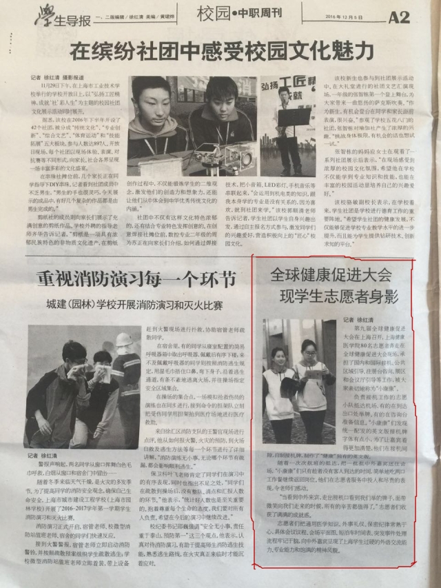 第九届全球健康促进大会在上海召开,上海健康医学院80名志愿者奔走在全球健康促进大会现场,承担了国内和国际接机、公共区域引导、注册台咨询、展区和会议厅引导等工作,被大家亲切地称为“小康康”。