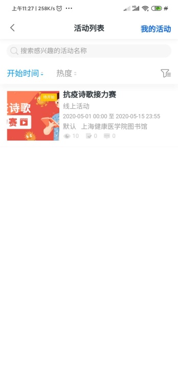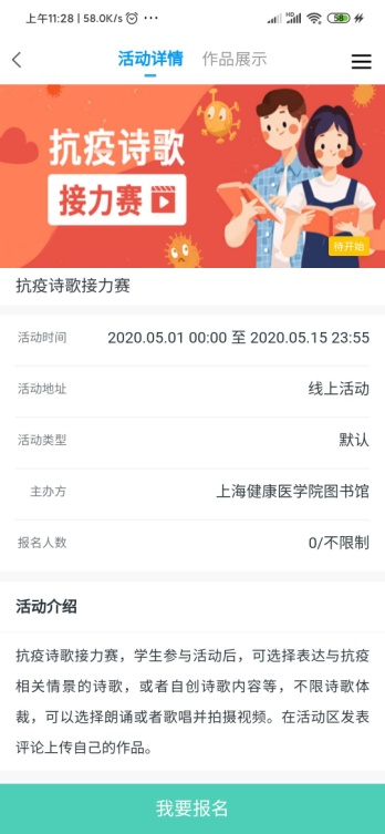 点击 “抗疫诗歌接力赛” 参与活动。选择“我要报名”,填入信息,点击“提交报名”即可参与活动,并可进行活动讨论。