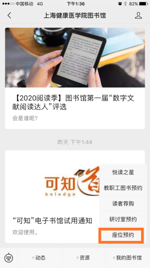 第二步,点击“我的图书馆”,进入座位预约系统。如图所示: