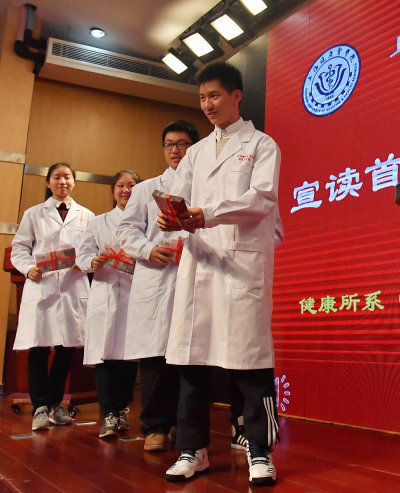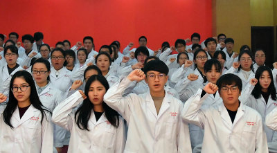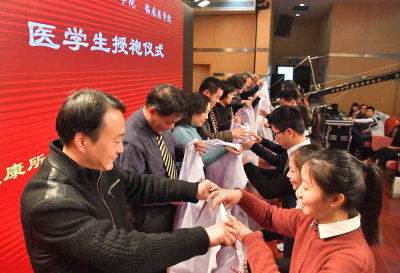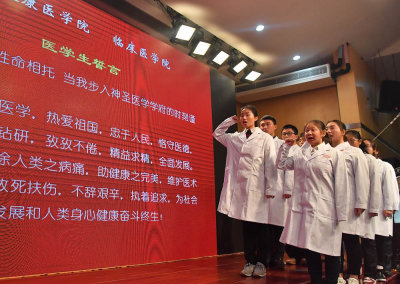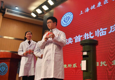 “健康所系,性命相托。当我步入神圣医学学府的时刻,谨庄严宣誓,我志愿献身医学,热爱祖国,忠于人民,恪守医德……”昨日(13日),在学期的最后一天,上海健康医学院104位首届临床医学本科新生从老师们的手中接过象征医学使命的神圣白袍,并举起右手做出庄严宣誓。