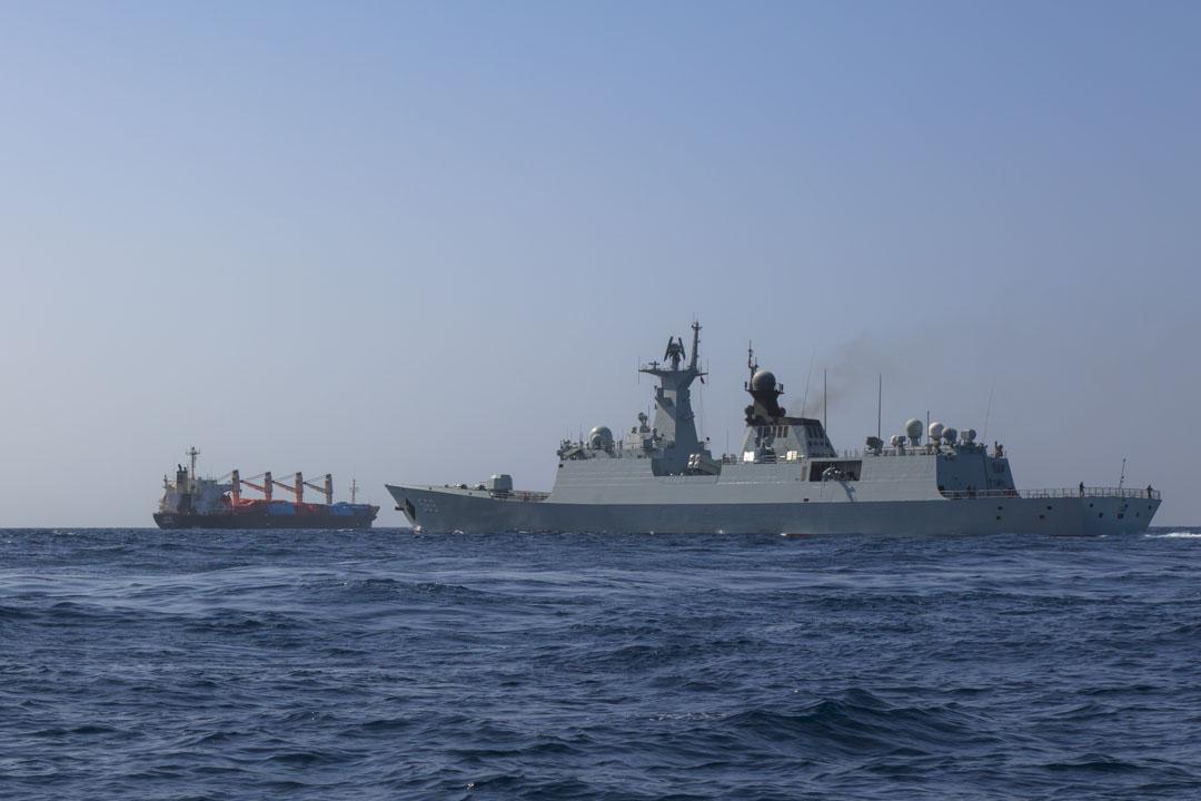 2017年当地时间4月12日,也门亚丁港中国海军第二十五批护航编队“玉林舰”为商船OS35护航。