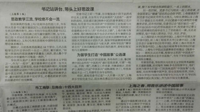 另一些时候,党委书记与校长一起上思政课,在全国首家以“健康”冠名的公办医学院,上海健康医学院党委书记郑沈芳作为主持人,与校长黄钢以及上海市卫计委副主任肖泽萍,开启《健康中国》课程的专题教育讲堂。还有些时候,党委书记会“值好最后一班”,在开设《法治中国》的华东政法大学,校党委书记曹文泽为即将离校的准毕业生上了思政最后一课:无论走到哪里,每个华政人都学法、守法、用法、护法。