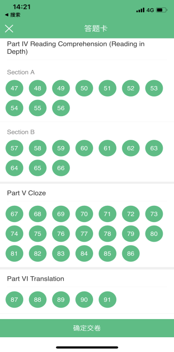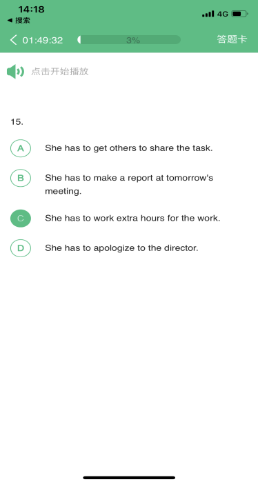 听力以section为单位播放。本场考试的听力部分共分___个section,每进入一个新的section,考生均需手动点击【开始听力考试】。同一个section内,待上一个听力音频播放完毕且答题倒计时截止后,系统会自动跳转至下一听力语篇。一个section结束后,考生需手动点击【下一题】进入新的section。