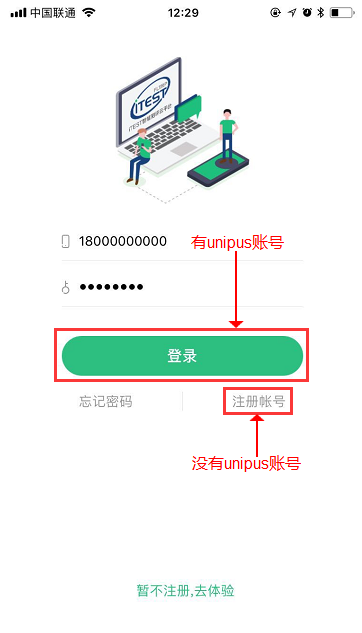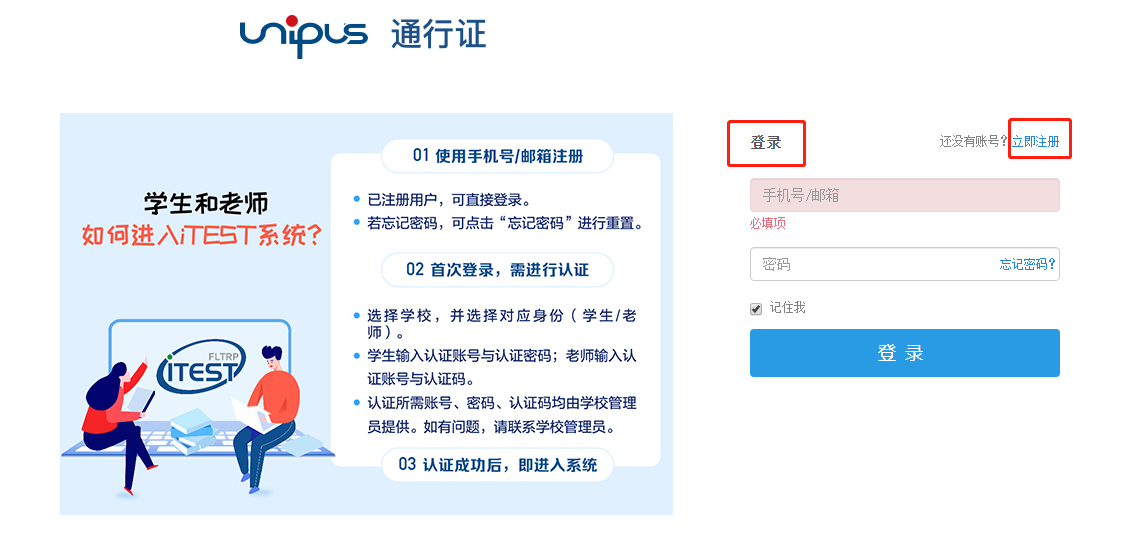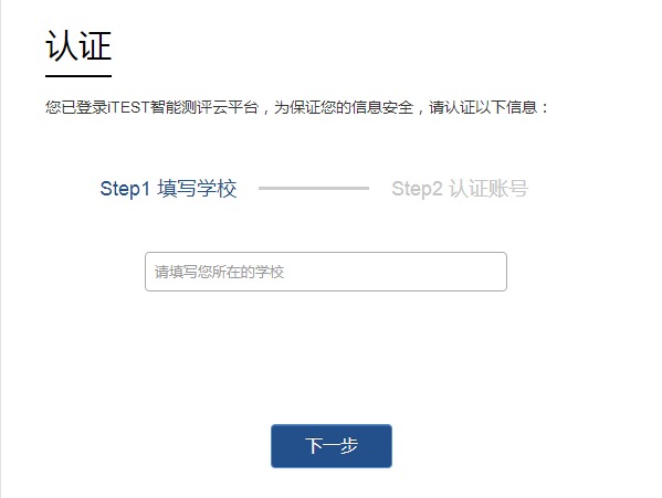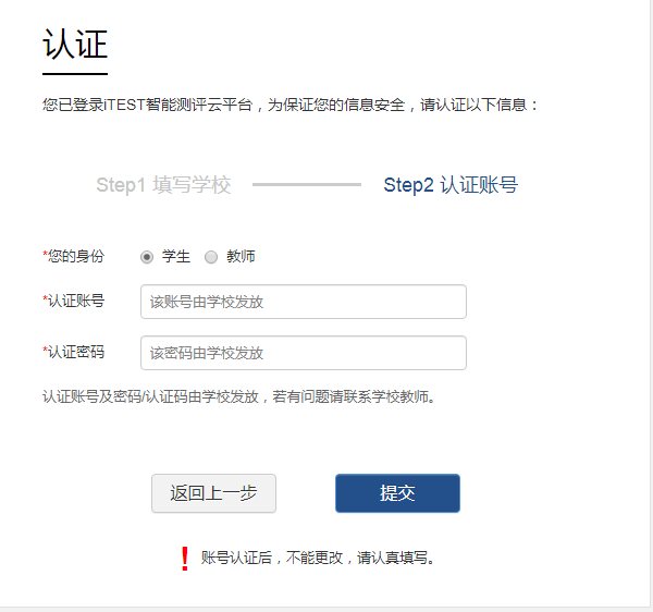 输入管理员老师通知的iTEST账号和密码,点击【提交】,进入下一步。
