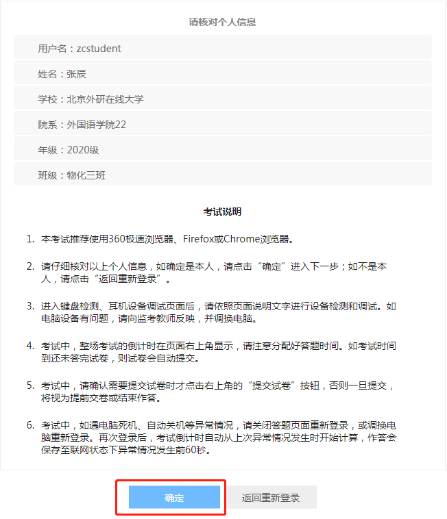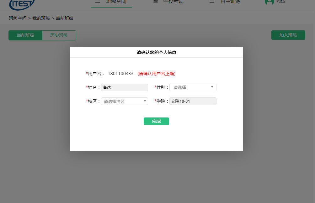 第四步:确认个人信息。请考生核对用户名、姓名、性别、校区、学院是否准确,点击【完成】。