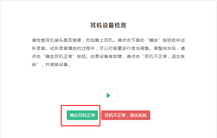 请务必保证耳机、键盘运行正常。进入考试页面后,请按照提示进行设备检测,切勿跳过此环节。检测完成后,请保持耳机、键盘不变动,不要插拔耳机、调音量等。
