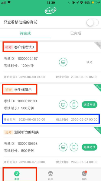 第四步:考试。从底部导航进入考试页面,在待完成的考试中,点击【去考试】或【继续考试】开始考试。*考试开始时间与截止时间是指允许考生点击【去考试】的窗口时间,如果考生错过窗口开放的进入时间,则无法进入考试;考试时长(即倒计时)是指作答该场考试规定的实际用时。