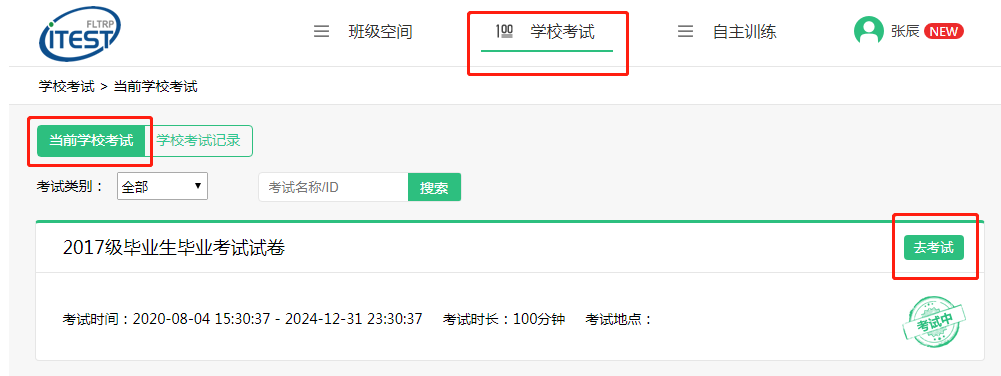 第五步:考试。进入系统后,点击【学校考试】,在【当前学校考试】下找到名为“XXXXXX”的考试。请学生在规定的考试时间范围内点击【去考试】,系统开始自动加载试卷,加载完毕即可开始考试。