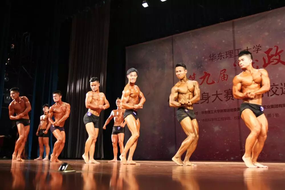 “前展双肱二头肌、前展双背阔肌、侧展胸部、后展双肱二头肌……”华东理工大学奉贤校区的大学生活动中心800人剧场,随着裁判长的口令和动感的背景音乐,台上的虞志成不时地“花式秀肌肉”。