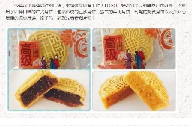 对于喜欢传统口味的师生们来说,鲜肉、莲蓉、五仁、绿豆沙这些经典的味道依然会在食堂供应,小伙伴们还不赶快结伴吃月饼去!