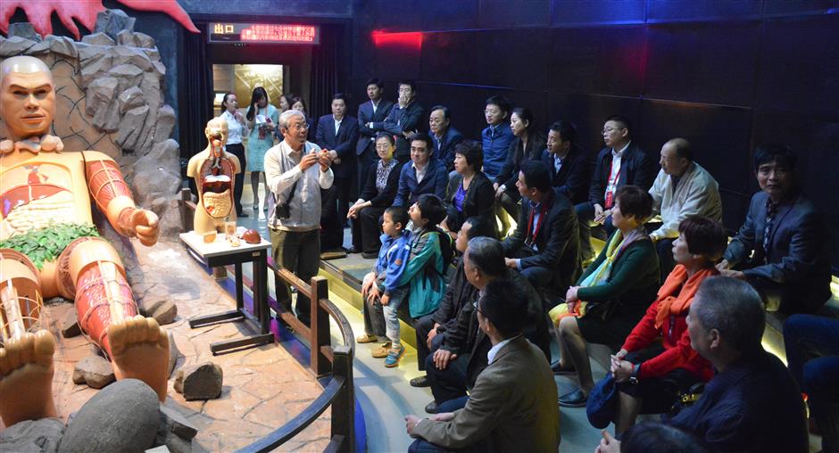 Sporting a green volunteer waistcoat, this former lecturer at the Shanghai University of Medicine and Health Sciences spends a day at each museum every week, explaining the structure of the human body and health-related issues to curious visitors in popular half-hour lectures.